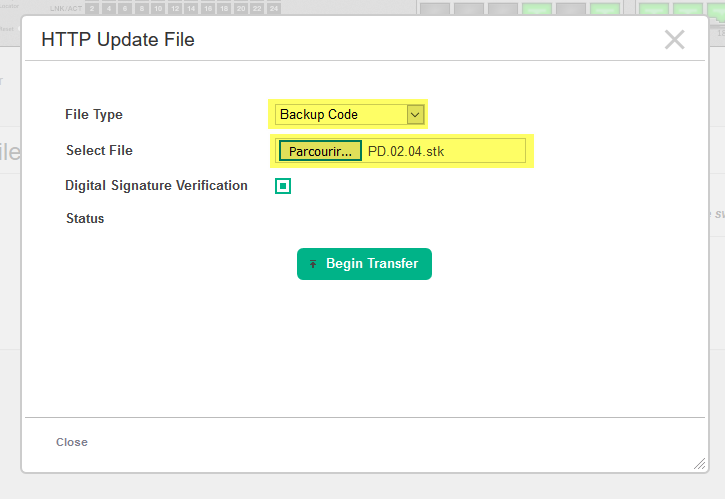 Au niveau du type de fichier, sélectionnez "Backup Code" et indiquez sur votre PC le fichier du firmware. Ici il s'agit de la version 02.04 du firmware. Cliquez sur "Begin Transfer".
