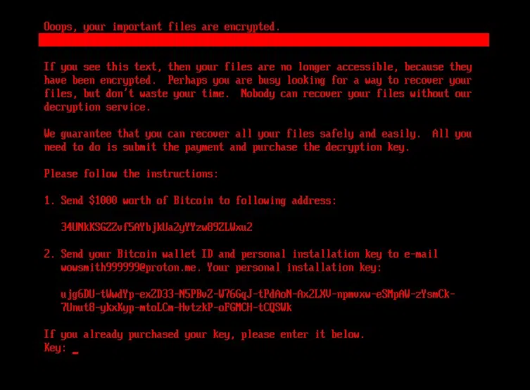 Dans le cas présent, la note de rançon est là pour réclamer 1 000$ en Bitcoin à la victime, afin d'obtenir une clé de déchiffrement de 32 caractères pour la récupération des données. Si la victime paie et entre la clé, le malware restaure le chargeur de démarrage original de Windows et déchiffre les données.