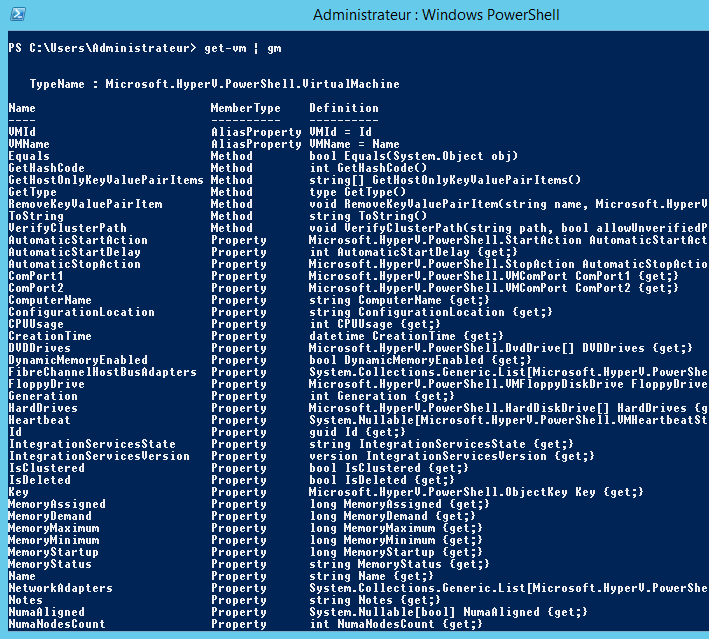 Ouvrez une console PowerShell, et saisissez la commande suivante pour voir comment on peut exploiter le commandlet Get-VM :