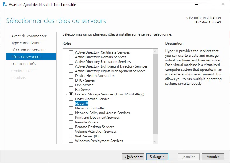 La capture d’écran suivante montre le « rôle » Hyper-V sous Windows Server 2022 qui s’installe à partir de l’OS lui-même :