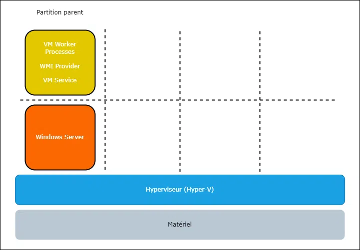 La partition parent (Windows Server) dispose d’un accès direct aux ressources de la machine physique et elle comprend maintenant de nouvelles applications et processus (VM Service, WMI Provider, VM Worker Processes, etc.) qui vont lui permettre notamment de gérer et déployer d’autres machines virtuelles. Dans la terminologie Hyper-V, les autres VMs qui sont créées subséquemment se nomment « partitions enfant » (child partitions).