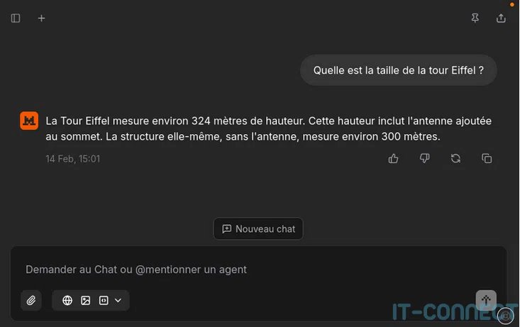 Par exemple, si je pose la question "Quelle est la taille de la tour Eiffel ?", les poids des neurones associés aux connaissances sur les monuments célèbres et les dimensions vont s'activer. De plus, elle va produire une phrase sensée et compréhensible pour me fournir la réponse. Voici un exemple :