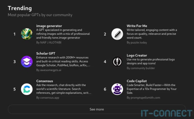 Cette notion de “prompt” gagne encore plus en intérêt dans d’autres solutions LLM comme ChatGPT. Il y est possible d’importer ou créer un prompt créé par vous-même ou d’autres utilisateurs, puis d’ouvrir plusieurs discussions distinctes, toutes basées sur les mêmes instructions initiales. Voici quelques exemples de prompt partagés qui sont appelés "GPTs sur ChatGPT :