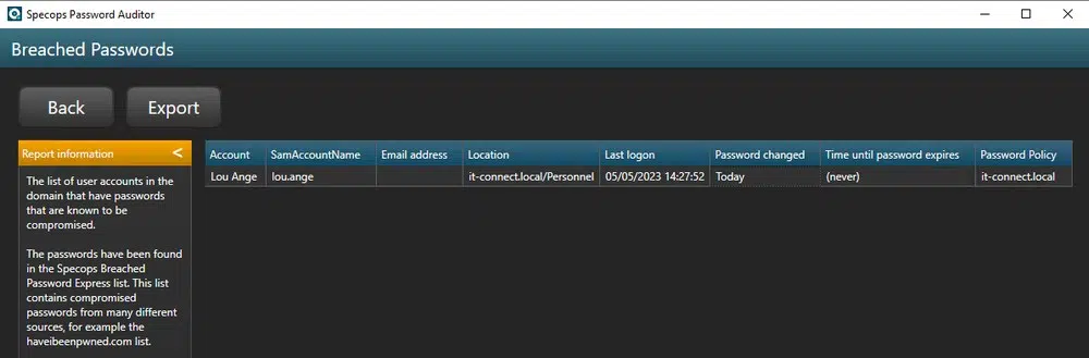 Intéressant également, la liste des comptes, dont le mot de passe, est identique. Sur mon lab, nous pouvons voir que plusieurs comptes ont le même mot de passe. Malheureusement, en production ce n'est pas rare qu'il y ait plusieurs comptes avec le même mot de passe... Grâce à cette analyse, vous pouvez y remédier. L'application indique également s'il y a plusieurs comptes admins avec un mot de passe identique !