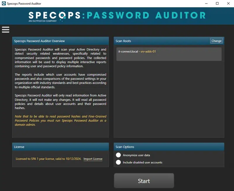 Cliquez sur "Start" pour lancer un audit sur votre annuaire Active Directory !