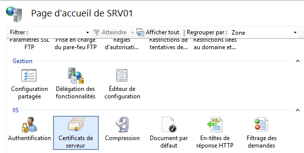 Ouvrez la console "Gestionnaire des Services Internet (IIS)" et sélectionnez votre serveur dans la console. Ensuite, sur la partie centrale double cliquez sur "Certificats de serveur".