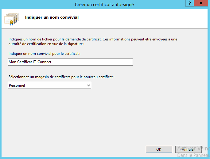 Donnez un nom à votre certificat, il faudra retrouver le certificat par la suite grâce à ce nom. Ensuite, stockez le certificat dans le magasin personnel.