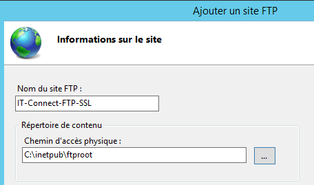 Créez un nouveau site FTP (clic droit sur le nom du serveur et ajouter un site FTP), ensuite nommez-le et indiquez le chemin que vous souhaitez.