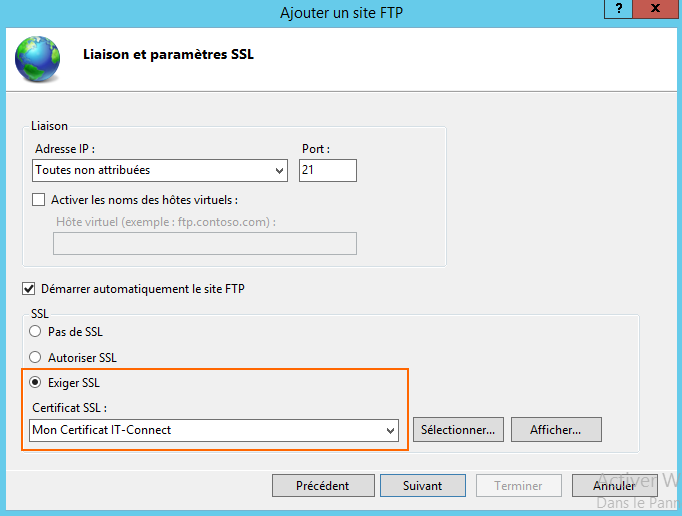 La partie de la configuration qui nous intéresse est celle-ci puisqu'elle concerne le SSL. Sélectionnez "Exiger SSL" pour que l'on puisse se connecteur sur le site FTP uniquement de façon sécurisée. De plus, au niveau du champ "Certificat SSL" dans la liste sélectionnez le certificat que nous avons créé précédemment.