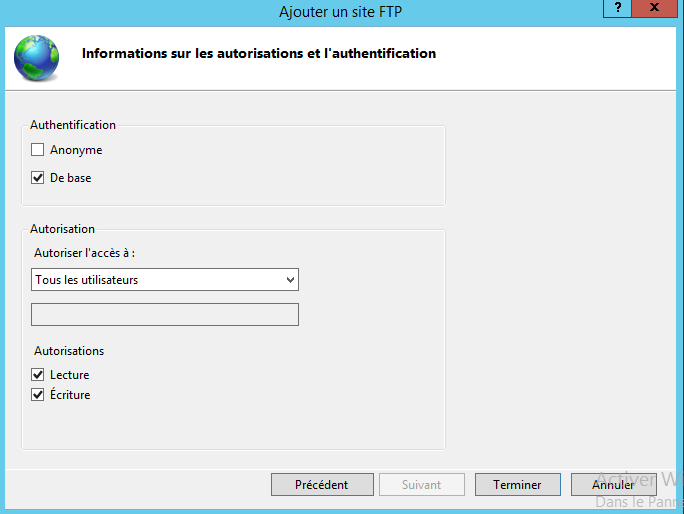 Finissez la création du site FTP en configurant les autorisations et l'authentification, comme ceci (par exemple - cela dépend de vos besoins) :