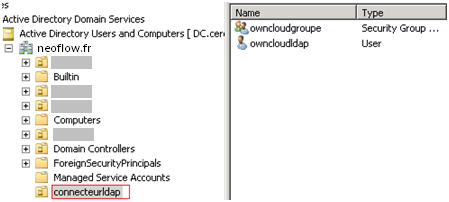 Cette première partie consiste à créer un utilisateur dit « connecteur » qui est nécessaire pour la communication LDAP entre le serveur AD et le client ownCloud. C’est cet utilisateur qui va s’authentifier sur l’Active Directory pour récupérer les informations demandées via la requête LDAP.