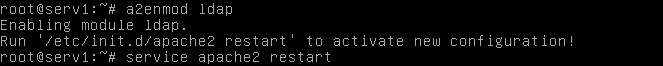 Au niveau de la configuration d’Apache, le module LDAP doit être activé pour permettre l’utilisation des fonctions LDAP en PHP. On utilise donc la commande « a2enmod » qui permet d’activer un module, puis on redémarre le serveur Apache pour activer la nouvelle configuration.