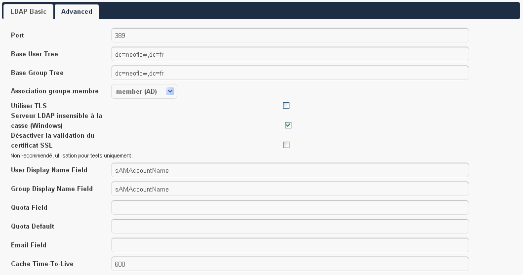 - Base User Tree : dc=neoflow,dc=fr – DN de base pour les utilisateurs.