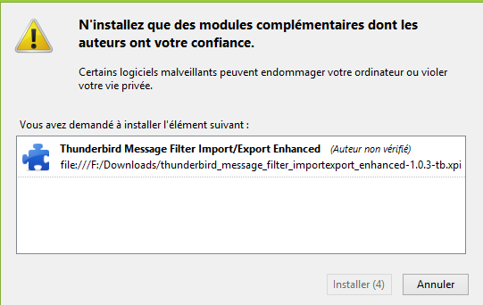 le module “Thunderbird Message Filter Import/Export“ n’est pas compatible avec Thunderbird 31.4.0. Y a-t-il une autre solution pour importer les filtres des messages ?