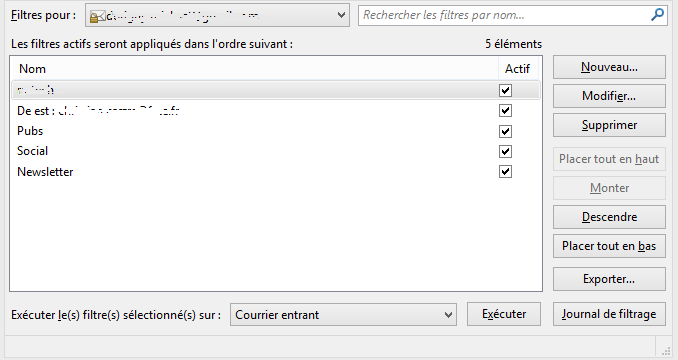 Comme ce module n’est plus développé, j’ai cherché une façon de retrouver mes filtres et j’ai trouvé ce lien https://forums.commentcamarche.net/forum/affich-19132645-recuperer-filtres-sur-thunderbird qui explique où trouver le fichier msgFilterRules.dat qui contient toutes les règles.