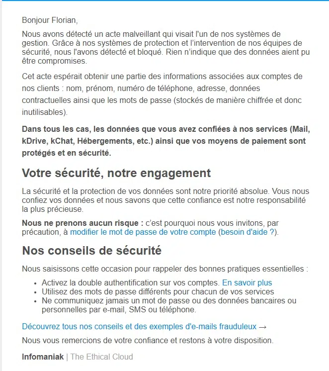 "Nous avons détecté un acte malveillant qui visait l'un de nos systèmes de gestion. Grâce à nos systèmes de protection et l’intervention de nos équipes de sécurité, nous l'avons détecté et bloqué. Rien n’indique que des données aient pu être compromises.", précise l'e-mail envoyé par Infomaniak.