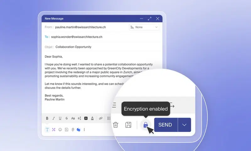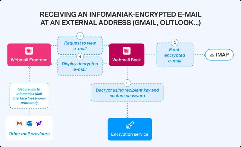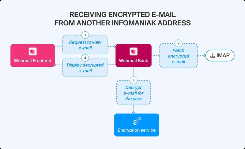 Lors de la rédaction d'un e-mail, l'utilisateur peut activer le chiffrement d'un simple clic. Le message est d'abord transmis de manière sécurisée aux serveurs d'Infomaniak, puis chiffré automatiquement avant l'envoi, y compris les pièces jointes jusqu'à 25 Mo. Lorsque votre destinataire est également un utilisateur d'Infomaniak, le mécanisme est entièrement automatique et il n'aura rien à faire pour lire votre e-mail.