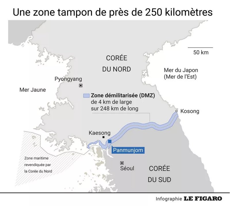 Sur l'image ci-dessous, on peut voir que la zone démilitarisée crée une véritable séparation entre la Corée du Nord et la Corée du Sud.