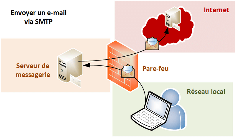 Éventuellement, on peut ajouter le protocole HTTPS pour accéder au Webmail. Par contre, le serveur de messagerie n'est pas autorisé à réaliser un ping vers le réseau local, ni à établir une connexion Bureau à distance ou un transfert de fichiers vers une machine du réseau local, etc. Le pare-feu devra refuser les flux des autres protocoles (ICMP, SSH, RDP, etc.) pour des raisons de sécurité.