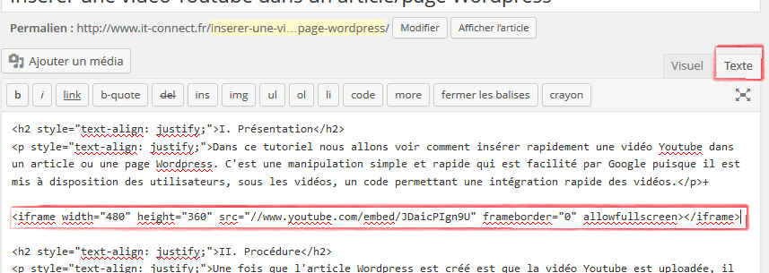 Nous allons ensuite avoir différentes possibilités de personnalisation, notamment en sélectionnant la taille de notre vidéo ou en choisissant une taille personnalisée. Une fois le code généré avec la bonne taille de vidéo, il faudra se rendre sur notre article ou notre page WordPress puis cliquer sur "Texte" pour rentrer en mode code HTML. Il faudra alors ensuite trouver où nous souhaitons insérer notre vidéo puis coller le code récupéré sur Youtube