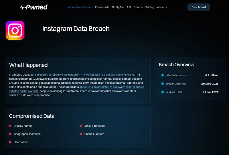De son côté, Troy Hunt a ajouté des enregistrements de cette fuite Instagram à la base globale de son service Have I Been Pwned. Il a ajouté ceux dont l'adresse e-mail de l'utilisateur est présente, soit 6,2 millions de comptes.
