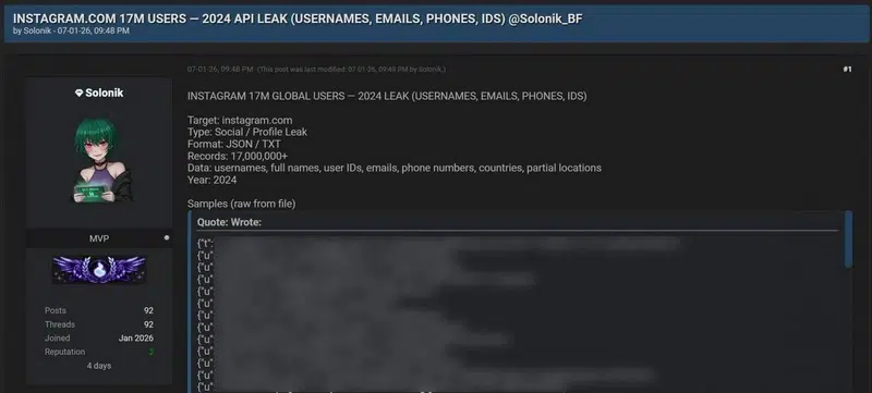 Sur BreachForums, un pirate informatique a publié un nouveau post pour proposer, gratuitement, une base de données avec des informations sur 17 millions d'utilisateurs Instagram. Selon l'auteur du post, il s'agit de données obtenues via l'API d'Instagram et datant de 2024. Néanmoins, certaines personnes pensent plutôt que c'est lié à un incident de scraping survenu en 2022, bien que Meta affirme n'avoir connaissance d'aucun incident lié à son API ces dernières années. C'est donc assez flou sur ce point et il pourrait s'agir d'une simple compilation.