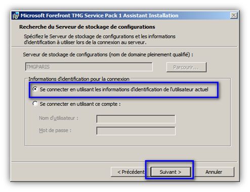 Choisir « Se connecter en utilisant les informations d’identification de l’utilisateur actuel » et cliquer sur « Suivant »