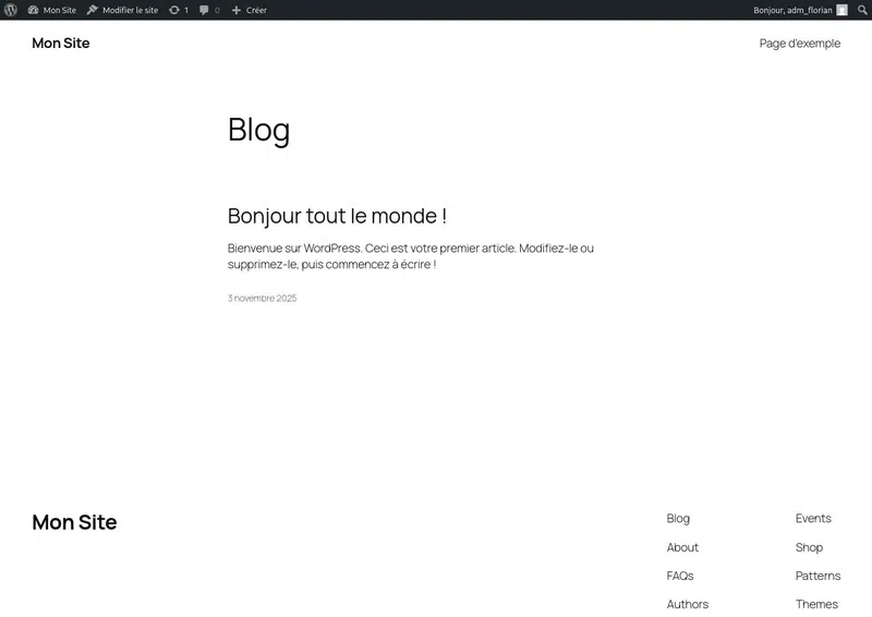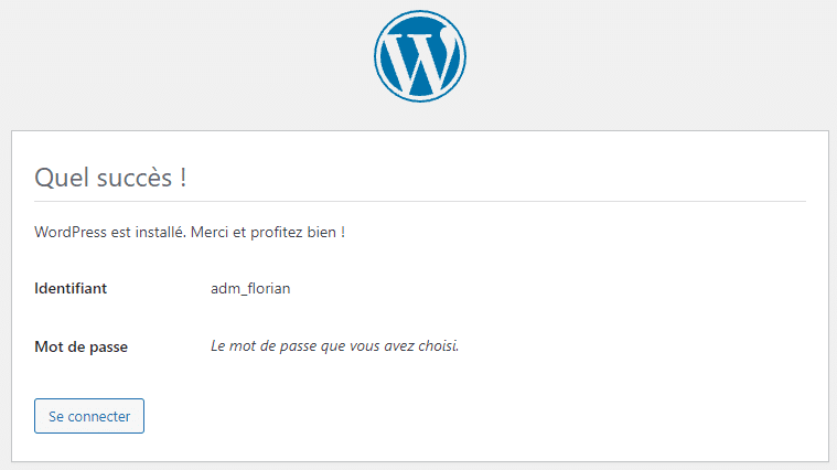 WordPress est installé ! Cliquez sur le bouton "Se connecter". Sur la page de connexion qui apparaît, authentifiez-vous avec le compte admin que vous venez de créer. Pour ma part, il s'agit du compte utilisateur "adm_florian".