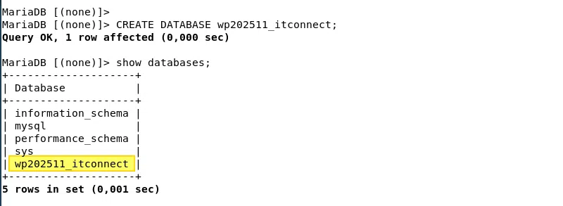 Première étape : la création de la base de données. Ne donnez pas un nom trop évident, mais parlant malgré tout. Par exemple, cela peut être : wp202511_itconnect. Ce nom reste parlant pour vous : on sait qu'il s'agit de la base de données WordPress (wp), créée en novembre 2025 pour le site "itconnect".
