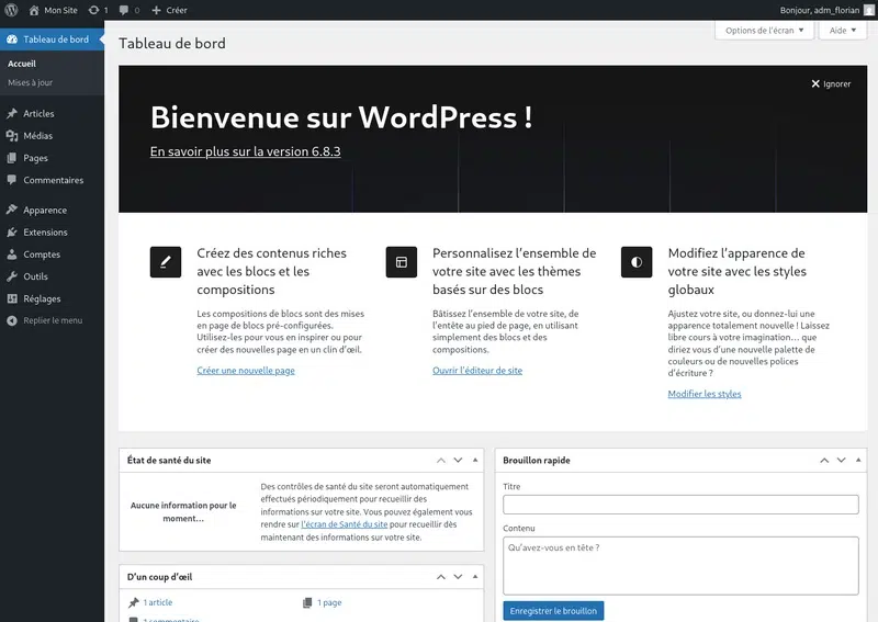 Suite à la connexion, vous arrivez sur l'interface d'administration de WordPress. C'est votre centre de contrôle pour créer vos pages, vos articles, mais aussi ajouter des extensions, des thèmes et configurer WordPress dans son ensemble.