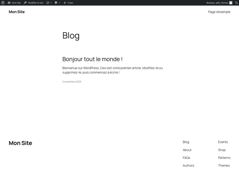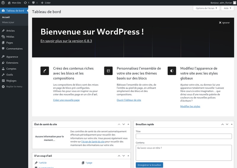 WordPress est installé ! Cliquez sur le bouton "Se connecter". Sur la page de connexion qui apparaît, authentifiez-vous avec le compte admin que vous venez de créer. Pour ma part, il s'agit du compte utilisateur "adm_florian".