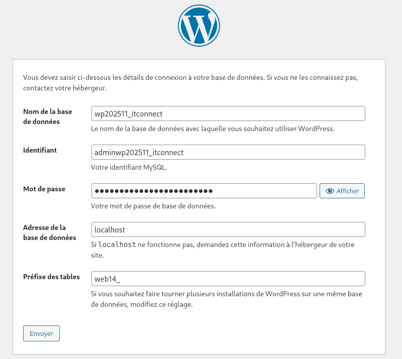 • Nom de la base de données : dans cet exemple, pour rappel, ce sera la valeur wp202511_itconnect