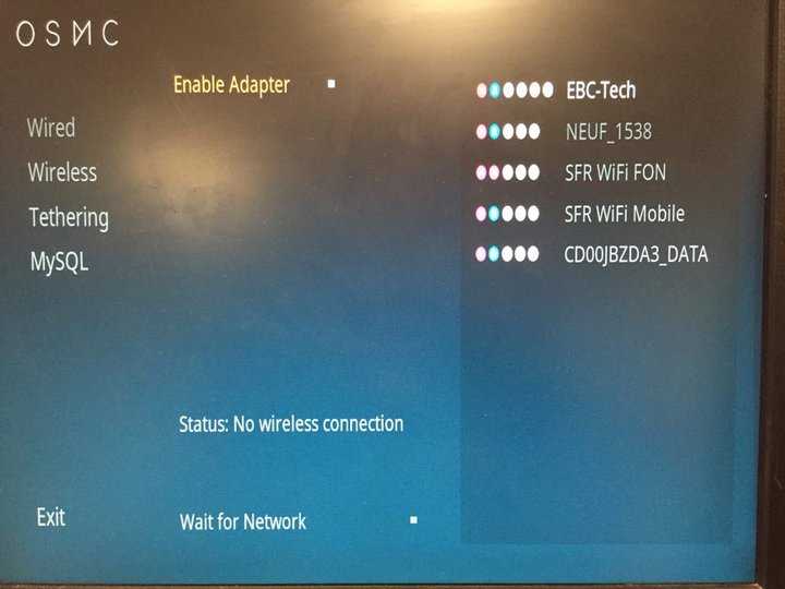 Si vous avez une clé WiFi de connecter, dès que votre système aura fini sa première installation, vous rendre dans l’onglet My OSMC > Network > Wireless, de cliquer sur Enable Adaptater, choisir votre réseau et d’y saisir votre clé de sécurité. Ensuite, dès que le système aura détecté une connexion internet, il ira chercher ses mises à jour automatiquement.