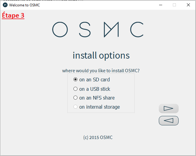 Sélectionner le support sur lequel vous voulez installer OSMC. Ici nous sélectionnerons « On an SD card ».
