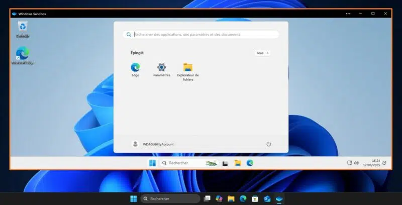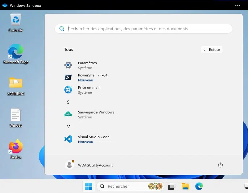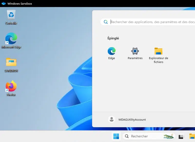 Une fois activée, recherchez "Sandbox" dans le menu Démarrer et ouvrez l’application. Une session Windows minimaliste se lance dans une fenêtre isolée.
