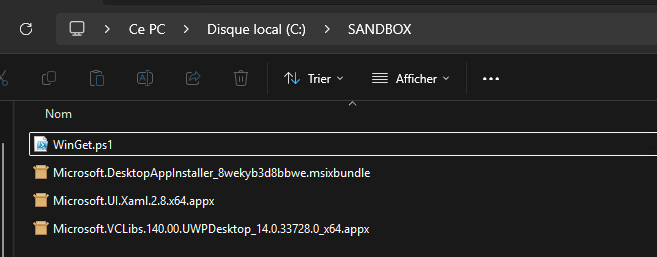Pour terminer, voyons comment installer WinGet dans Windows Sandbox à l’aide des packages APPX et MSIXBUNDLE. Cette méthode présente l’avantage d’être plus fiable, plus rapide, et entièrement hors ligne, car les fichiers nécessaires sont préalablement téléchargés puis accessibles directement depuis la sandbox.