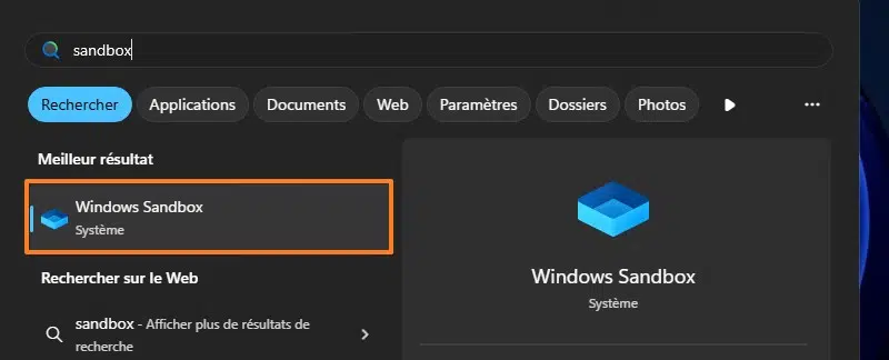 Pour lancer un bac à sable, vous n'avez qu'à rechercher Windows Sandbox sur votre PC et à le lancer.