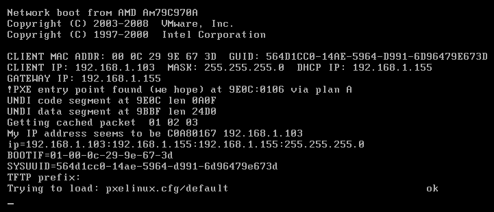 Sur la copie d'écran ci-dessous, on remarque que le serveur DHCP (dnsmasq) distribue une adresse IP au client, qui va ensuite charger via PXE la configuration par défaut (pxelinux.cfg/default).