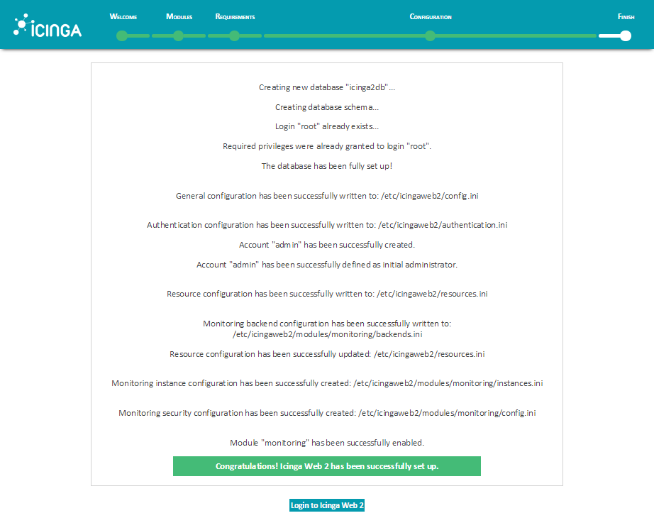 Authentication configuration has been successfully written to: /etc/icingaweb2/authentication.ini