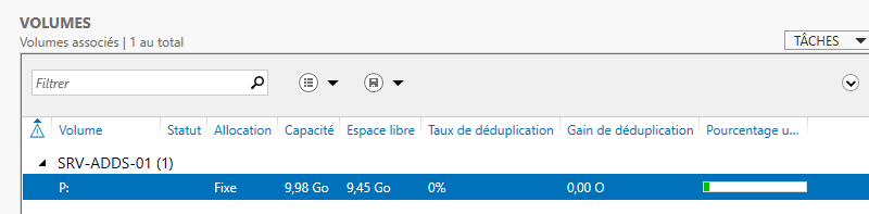 Remarque : sur Windows Server, la déduplication s'active de façon indépendante pour chaque volume, sur chacun des disques du serveur. Dans cet exemple, c'est sur un disque dédié aux données, associé à la lettre "P" que la déduplication va être activée.