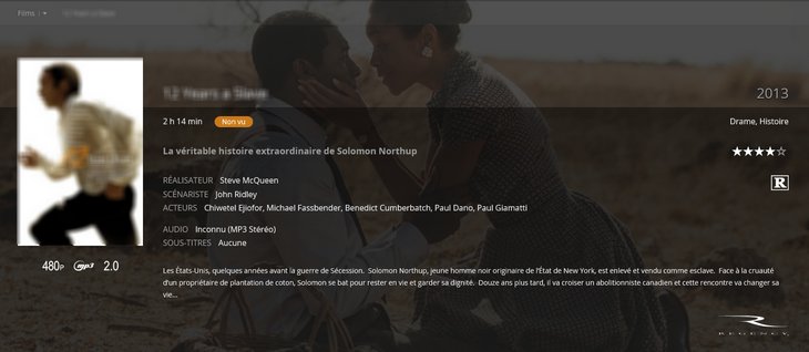 Si l'on souhaite lire le média, il suffit de cliquer sur la jaquette. Pendant une lecture, on peut choisir la piste audio, la piste des sous-titres, mais aussi la qualité que l'on souhaite, ce qui permet notamment de baisser la qualité lorsqu'on se trouve en extérieur sur une connexion de piètre qualité.