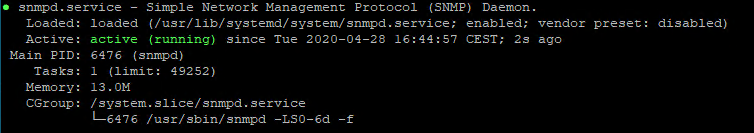 De la même façon, nous pouvons afficher le statut du service snmpd avec cette commande :