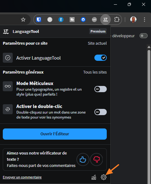 Ensuite, pour voir si cela fonctionne, le plus simple, c'est d'utiliser l'éditeur intégré à l'extension. Cliquez de nouveau sur l'icône de l'extension, puis sur "Ouvrir l'éditeur". Saisissez du texte et effectuez volontairement une faute... Cela va déclencher la vérification de l'orthographe et de la grammaire et mettre en évidence votre erreur.