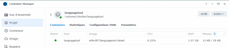 Désormais, lancez Container Manager puis créez un nouveau projet nommé languagetool. Ce projet contiendra un seul et unique conteneur. Spécifiez le répertoire /docker/languagetool créé précédemment et indiquez ce code pour Docker Compose :