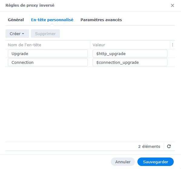 Connectez-vous à l'interface de DSM, ouvrez le "Panneau de configuration" et accédez à la section "Portail de connexion". Ici, cliquez sur l'onglet "Avancé" puis sur le bouton nommé "Proxy inversé". Créez une nouvelle entrée avec le bouton "Créer" puis déclarez votre application :