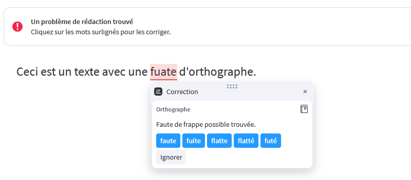 Si votre installation fonctionne bien, vous devriez avoir la correction suggérée par LanguageTool (comme sur l'exemple ci-dessous). Sinon, il y aura un message d'erreur visible à l'écran. Par exemple, cette erreur peut indiquer que le serveur est introuvable.