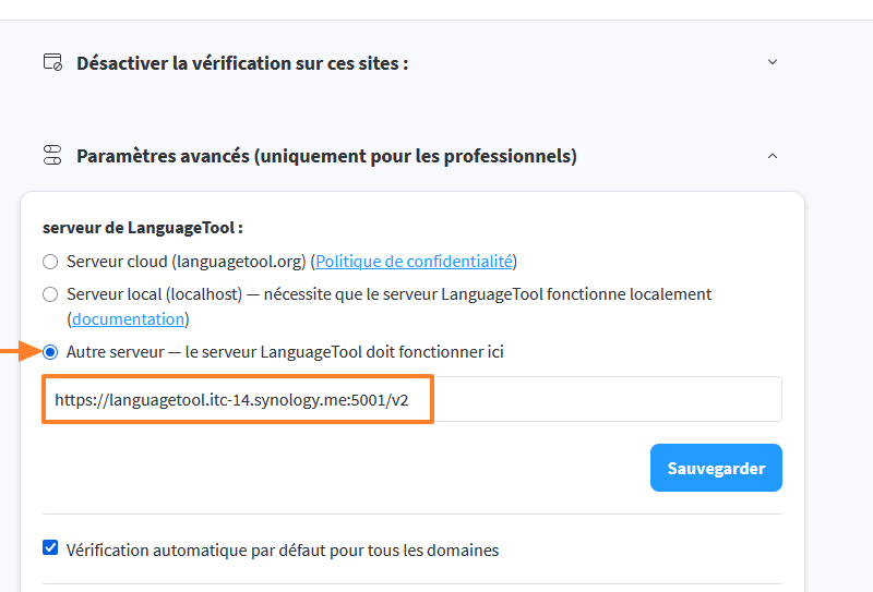 Descendez dans la page dans le but d'afficher les paramètres avancés. Ici, cochez l'option "Autre serveur - le serveur LanguageTool doit fonctionner ici", puis spécifiez l'adresse complète de votre serveur. Pensez à préciser /v2 à la fin de l'URL. Sauvegardez. Pour travailler uniquement sur un réseau local, ou à des fins de tests, nous pourrions spécifier une URL telle que : http://192.168.1.148:8010/v2.