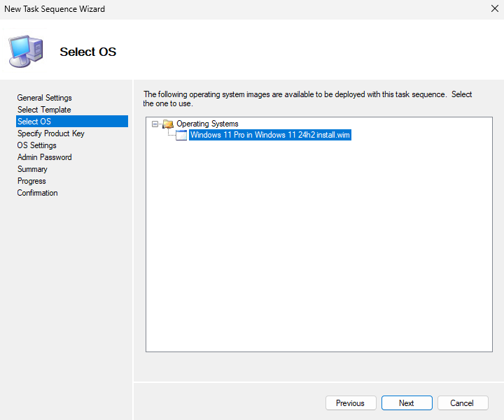 Poursuivez. À l'étape "Select OS", il va falloir choisir l'image Windows 11 que vous venez d'importer. D'où l'intérêt d'importer l'image avant de créer la séquence de tâches.