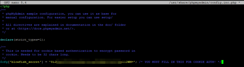 Copiez la valeur retournée en sortie. Nous allons l'insérer dans le fichier de configuration de PhpMyAdmin. Ouvrez le fichier avec nano (ou un autre éditeur de texte) :