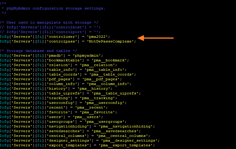 $cfg['Servers'][$i]['controluser'] = 'pma2022'; $cfg['Servers'][$i]['controlpass'] = 'MotDePasseComplexe';
